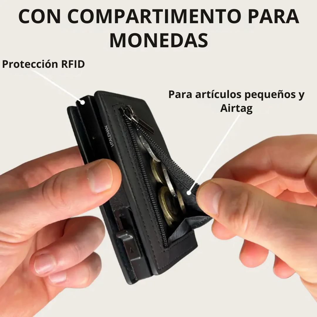 Gracias a sus compartimentos especiales, la cartera Vitaleman ofrece espacio suficiente para guardar tus billetes e incluso tus monedas sin arrugarlos, algo que la mayoría de las carteras finas no permiten. Se acabaron los billetes arrugados y las monedas esparcidas por los bolsillos. Todo está bien ordenado, accesible y en su sitio, sin añadir volumen.