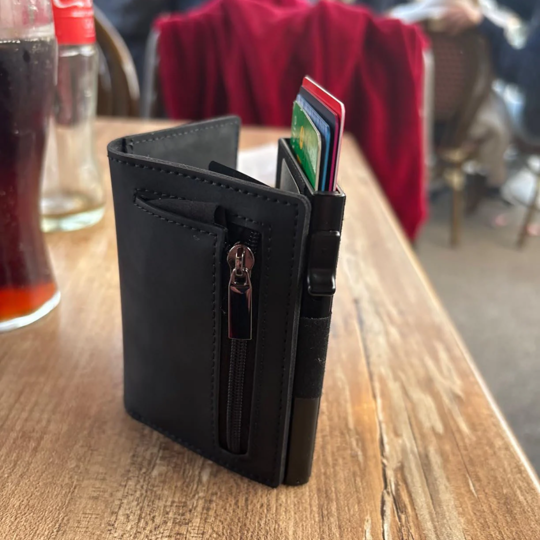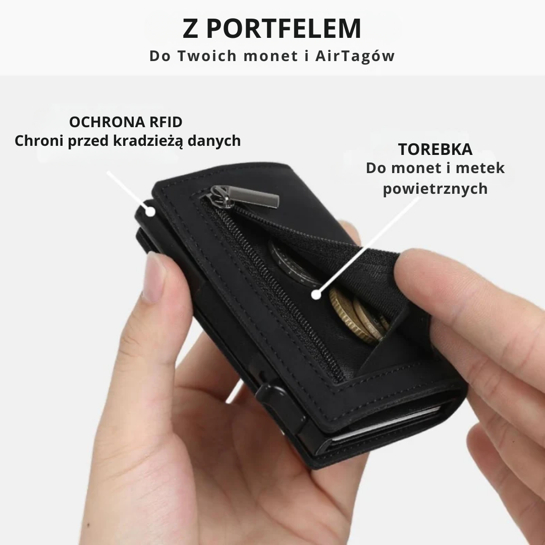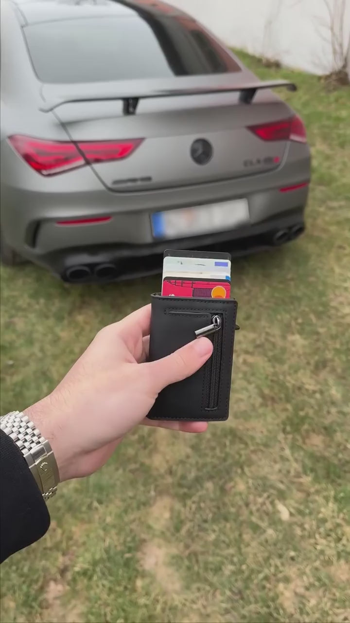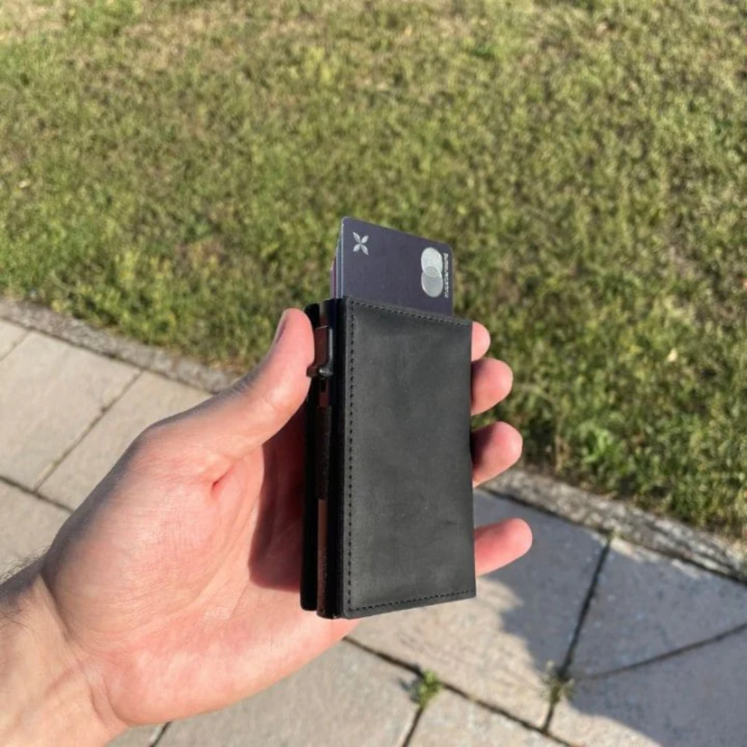Dzięki naszej inteligentnej funkcji przesuwania wszystkie karty pojawiają się po jednym kliknięciu, bez ryzyka wypadnięcia. Koniec z niekończącym się przeszukiwaniem portfela lub problemami przy kasie. Jednym płynnym ruchem karty są uporządkowane i gotowe do użycia.